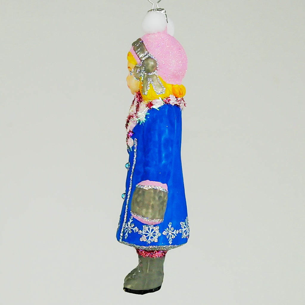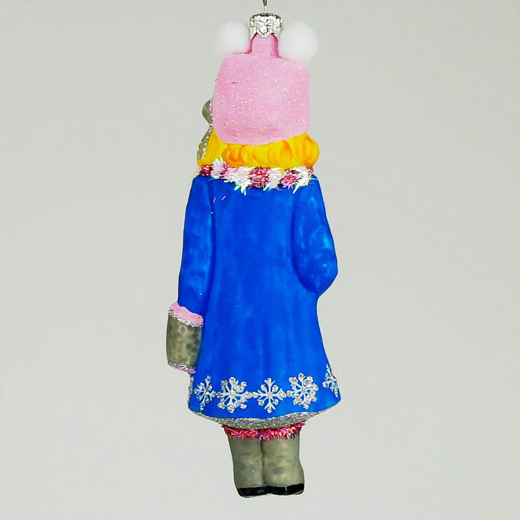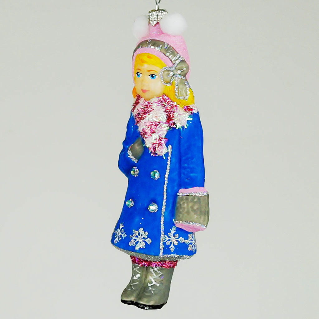 Dziewczynka w niebieskim płaszczyku bombka choinkowa szklana ręcznie malowana 13 cm
