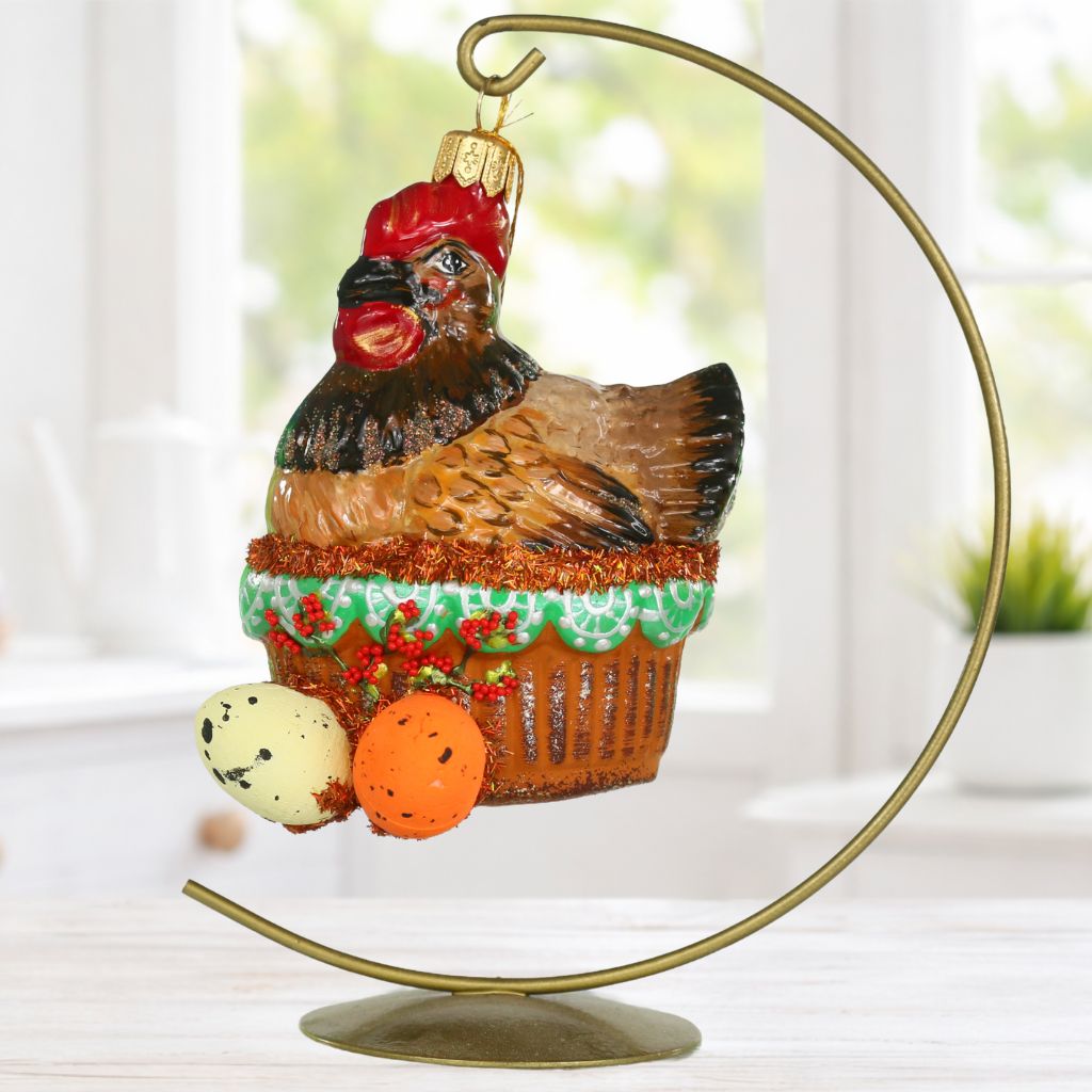 Szklana kura umieszczona na dekoracyjnym stojaku staje się wyjątkową ozdobą wielkanocnego stołu. Dzięki temu delikatne szkło jest pięknie wyeksponowane i przyciąga uwagę podczas świątecznych spotkań.