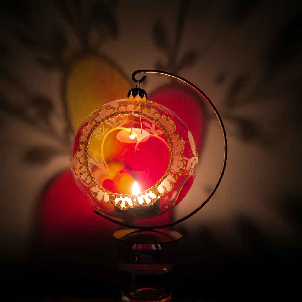 Nasz lampion to okrągła bombka szklana w całości ręcznie malowana z otworem na podgrzewacz / świeczkę typu tealight.