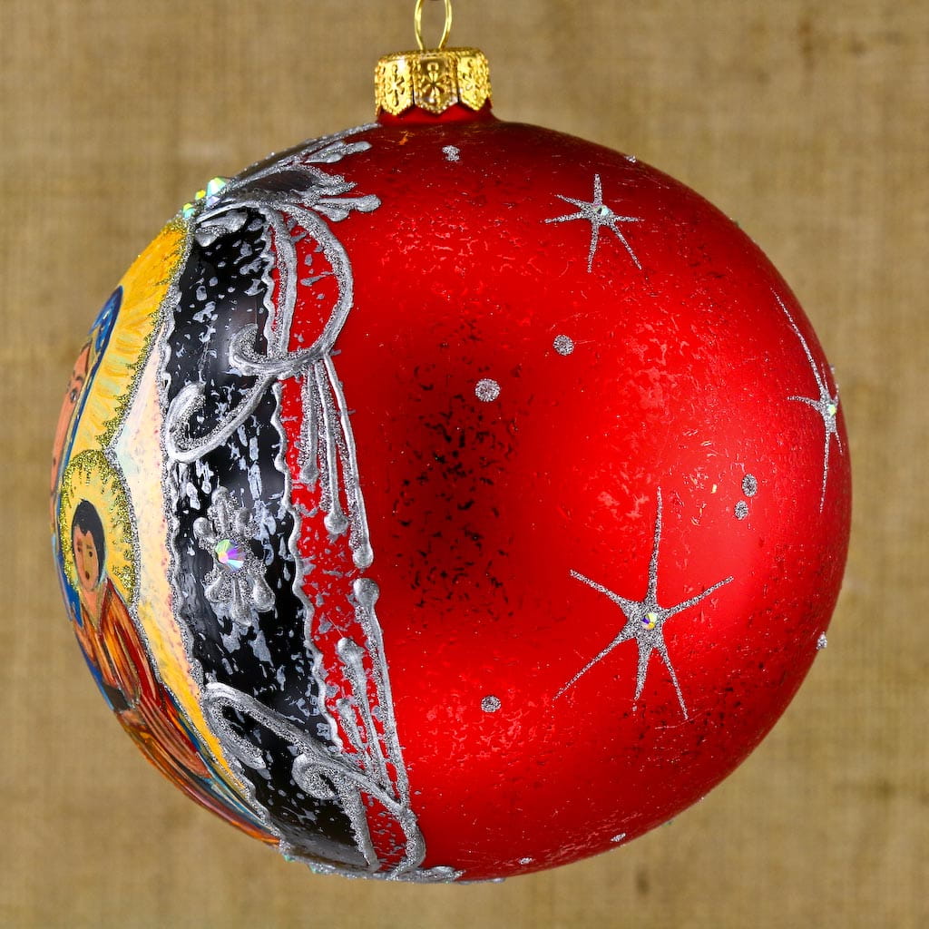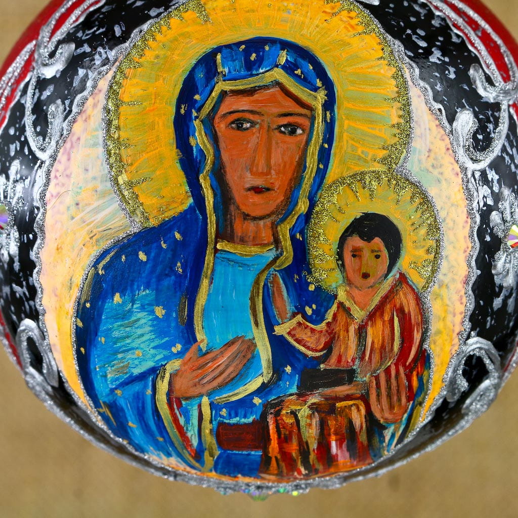 Bombka z wizerunkiem Matki Boskiej Częstochowskiej z małym Jezuskiem, wykonana z dmuchanego szkła.