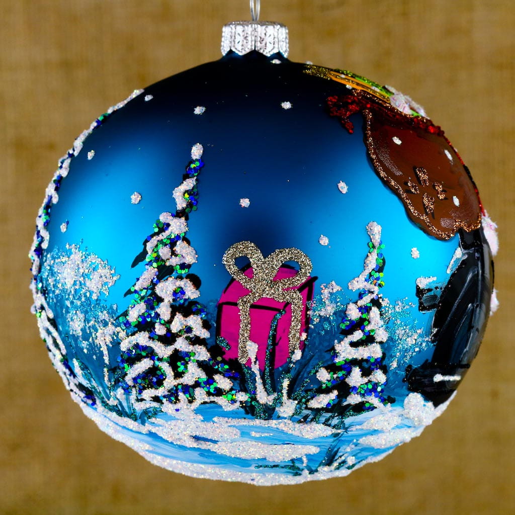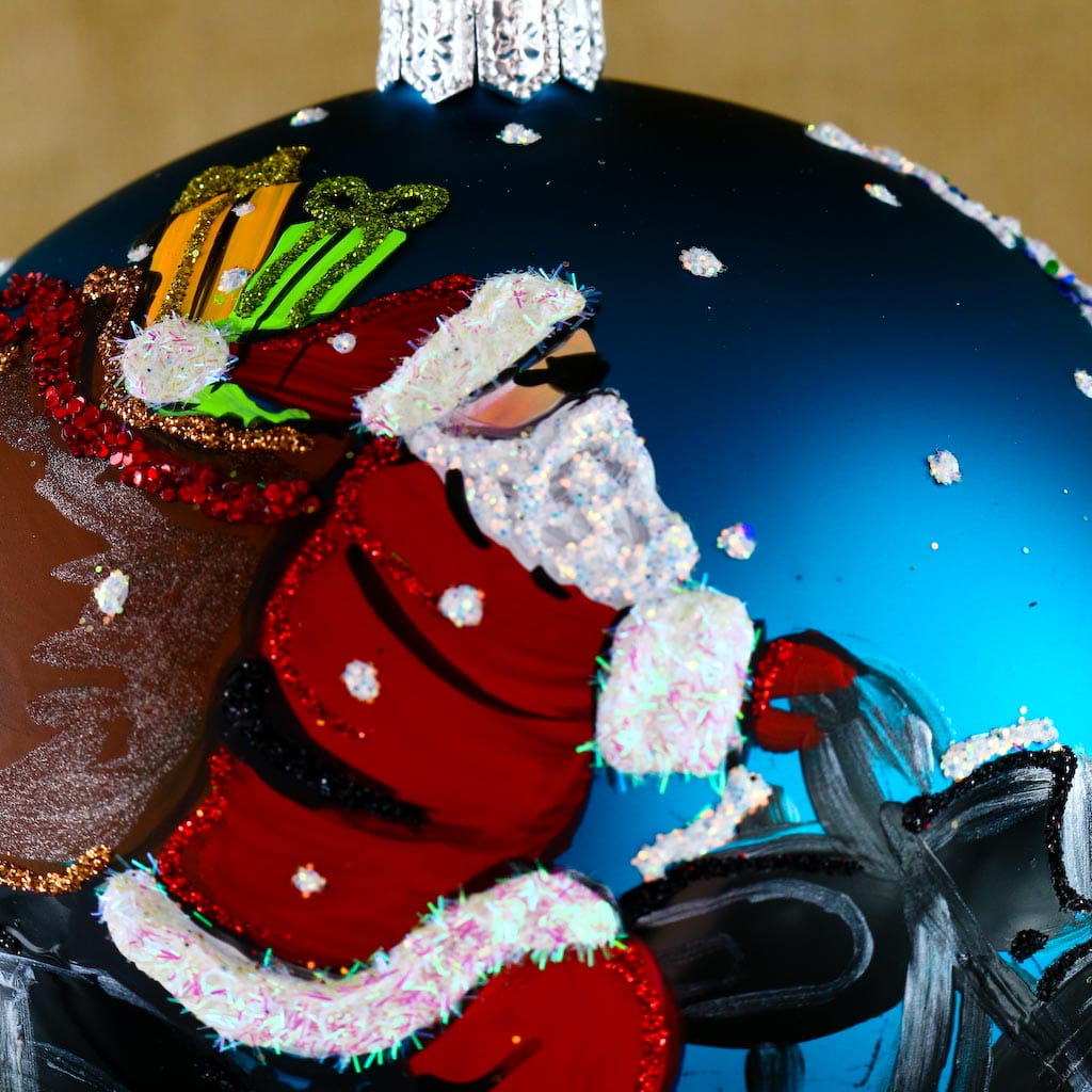 Bombka szklana ręcznie malowana, wykonana z dmuchanego szkła, bogato zdobiona motywem Mikołaja na skuterze z prezentami