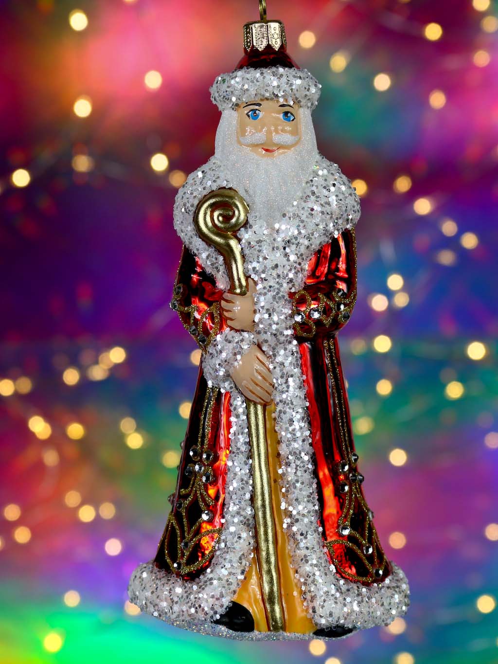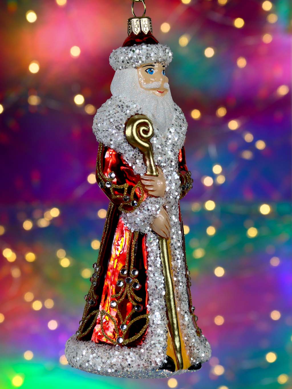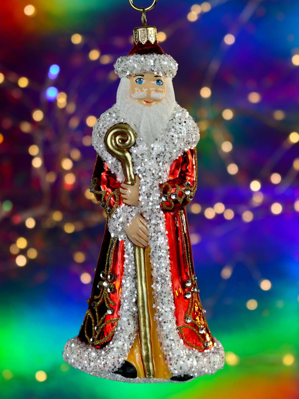Mikołaj w śnieżnym płaszczu bombka szklana ręcznie malowana 15 cm