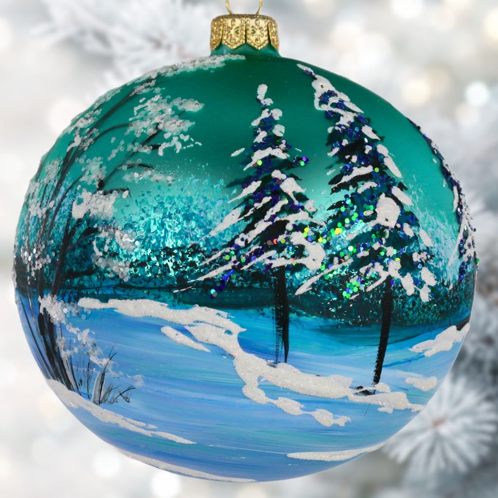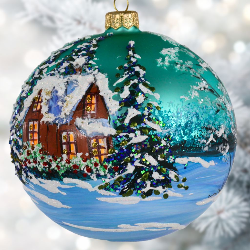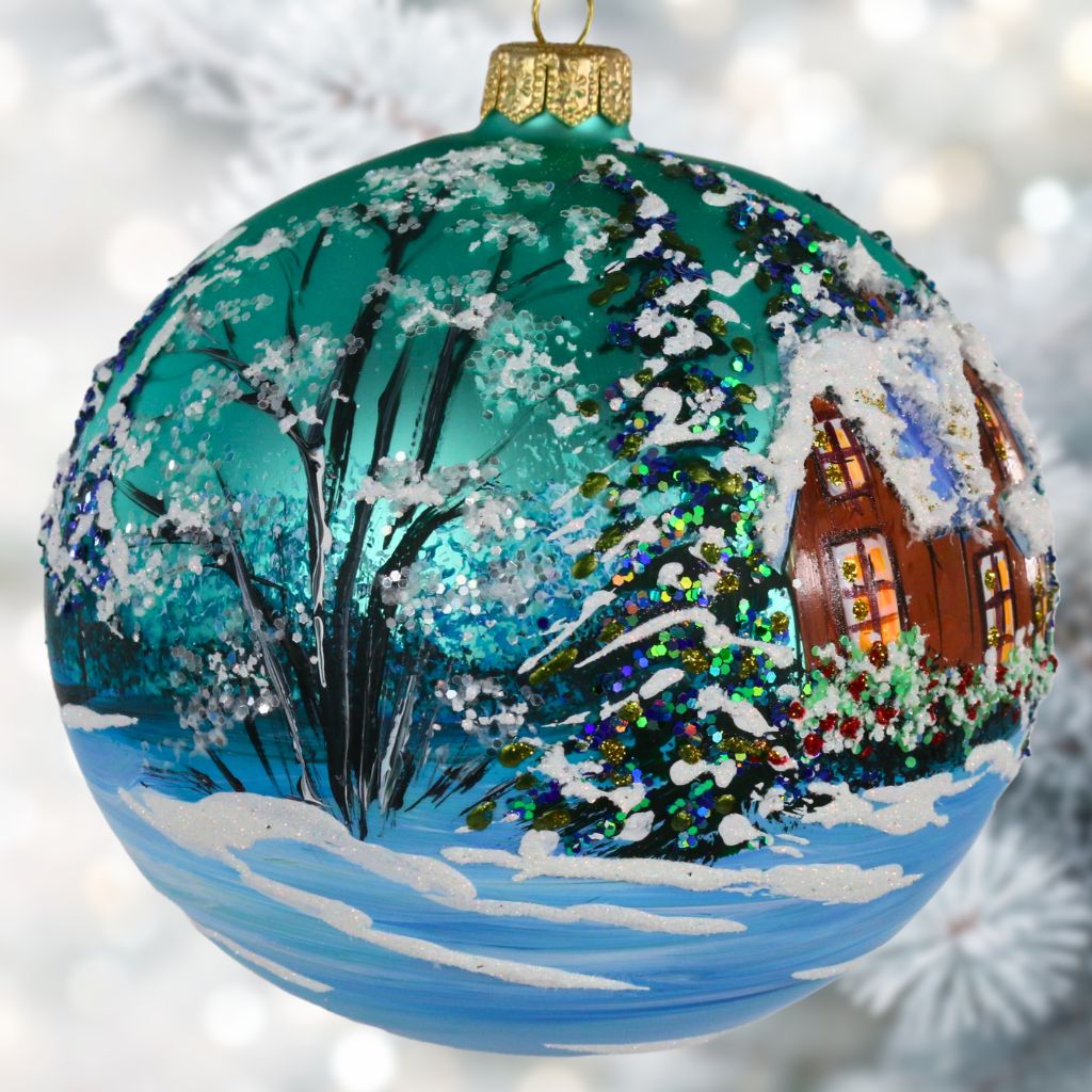 Bombka przedstawiająca pejzaż pt "Biały domek". Bombka wykonana z dmuchanego szkła, ręcznie malowana z dbałością o najmniejsze detale,