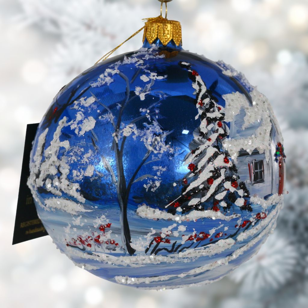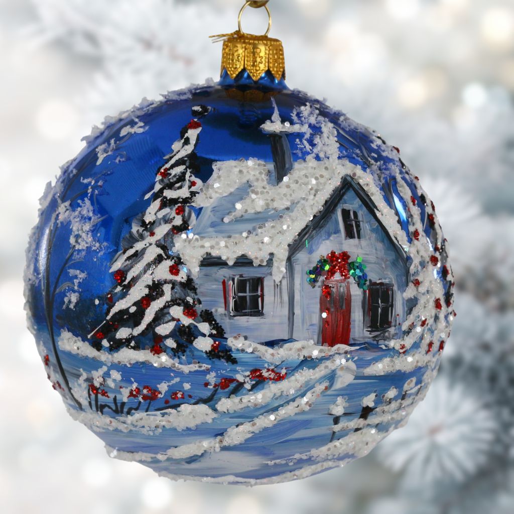 Pejzaż domek z czerwonymi drzwiami, bombka szklana ręcznie malowana 10 cm