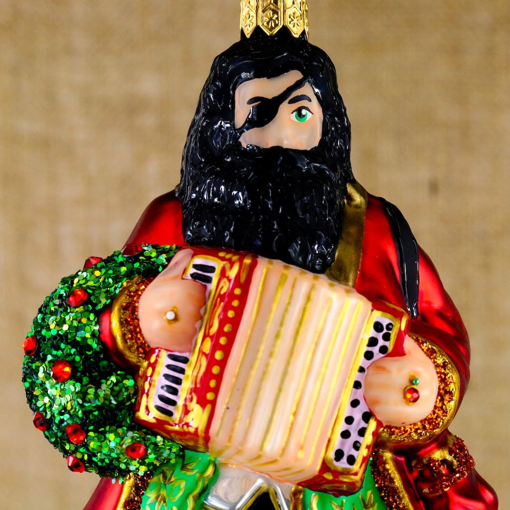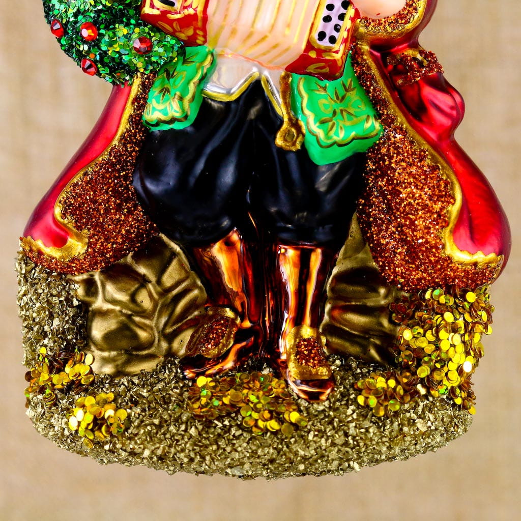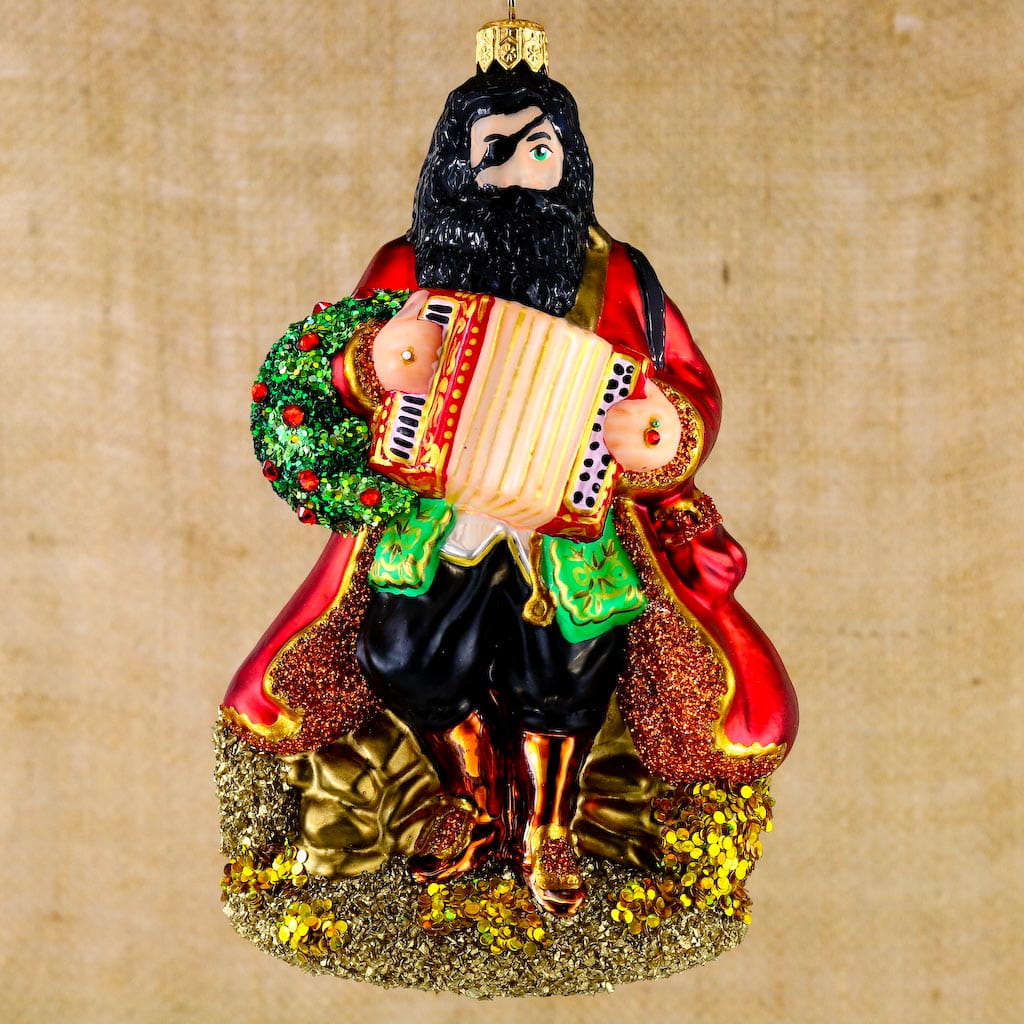 Duża bombka pirat grającegy na akordeonie. Bombka szklana ręcznie malowana, wykonana z dmuchanego szkła.