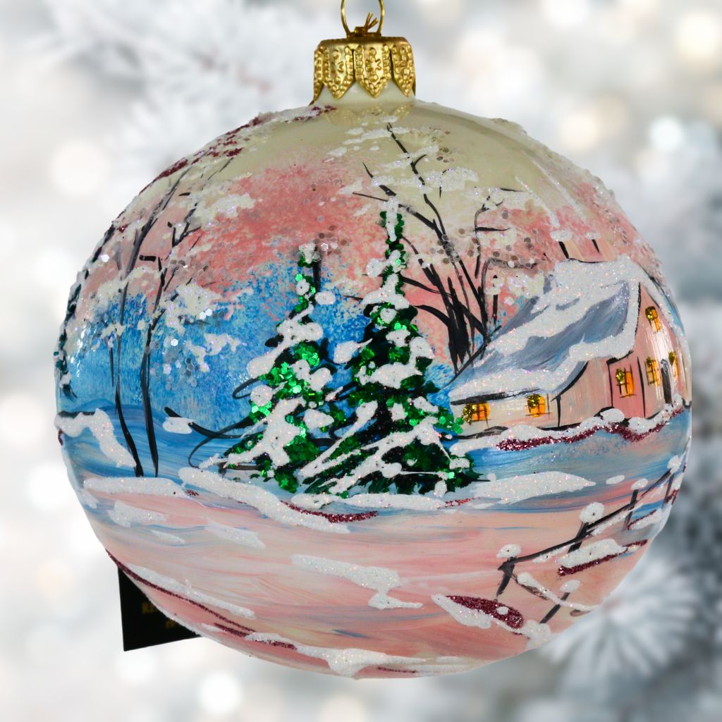 Pudrowy domek, bombka choinkowa ręcznie malowana szklana 10 cm