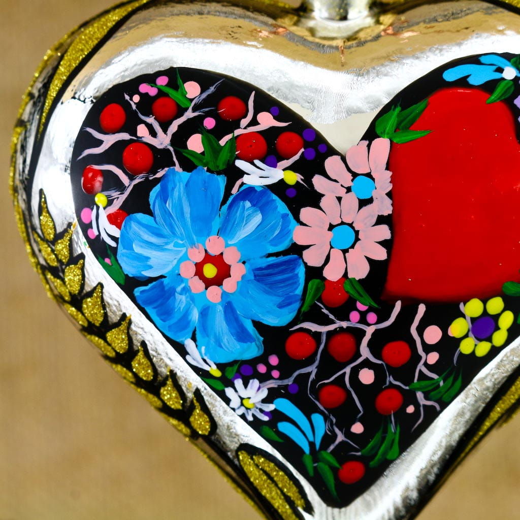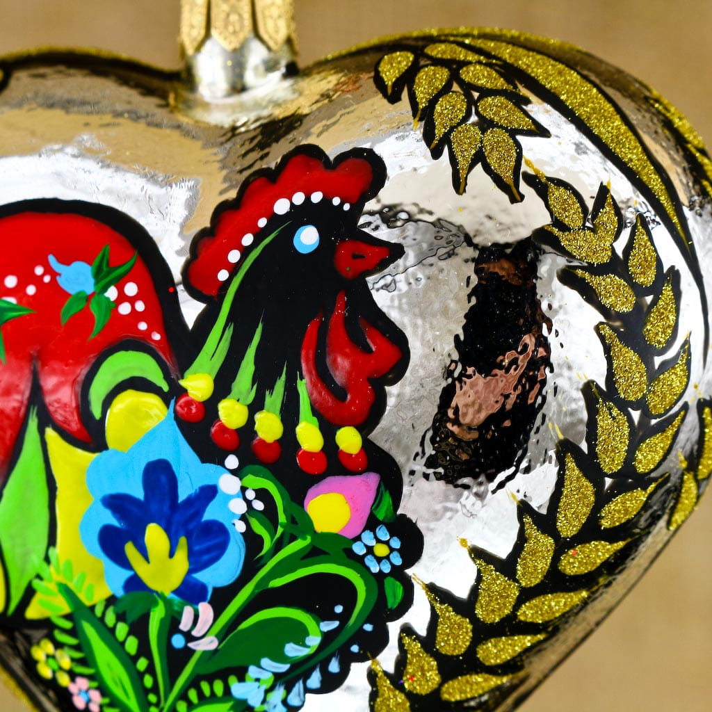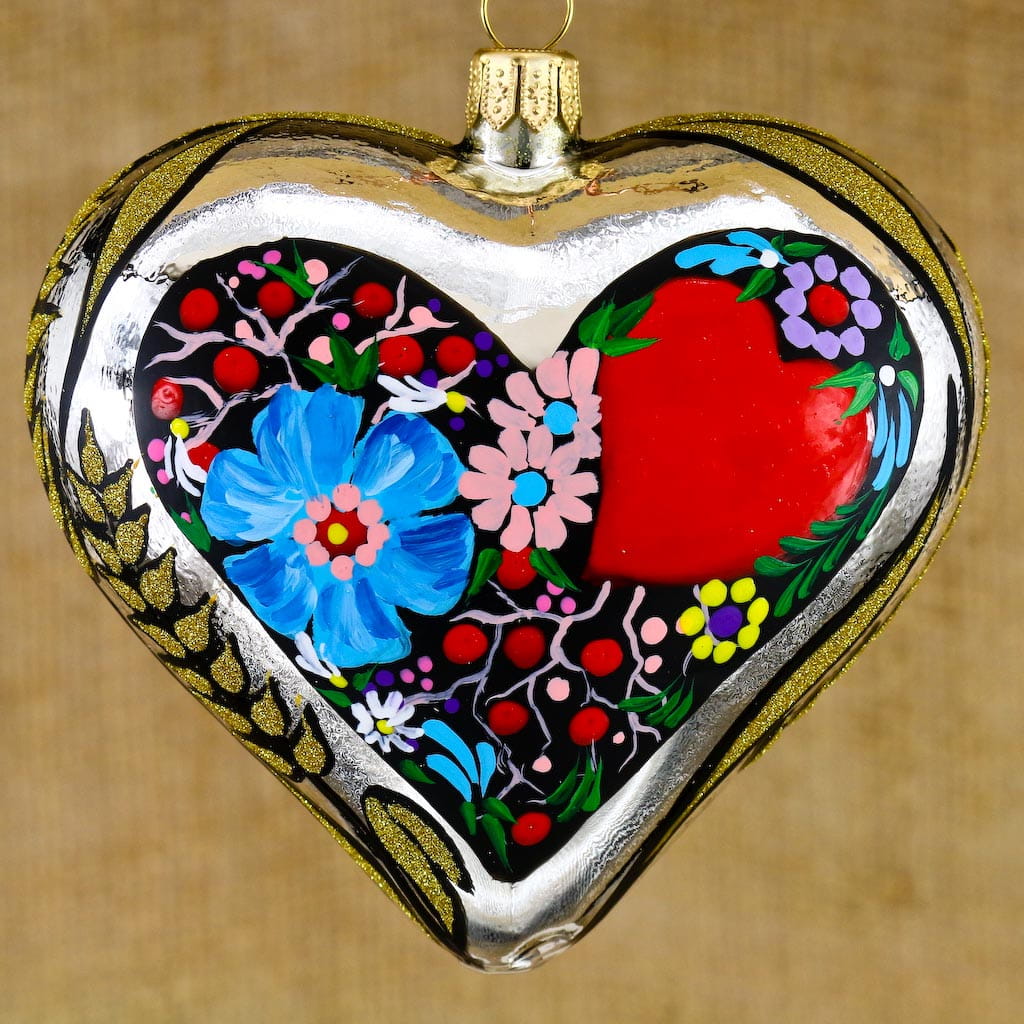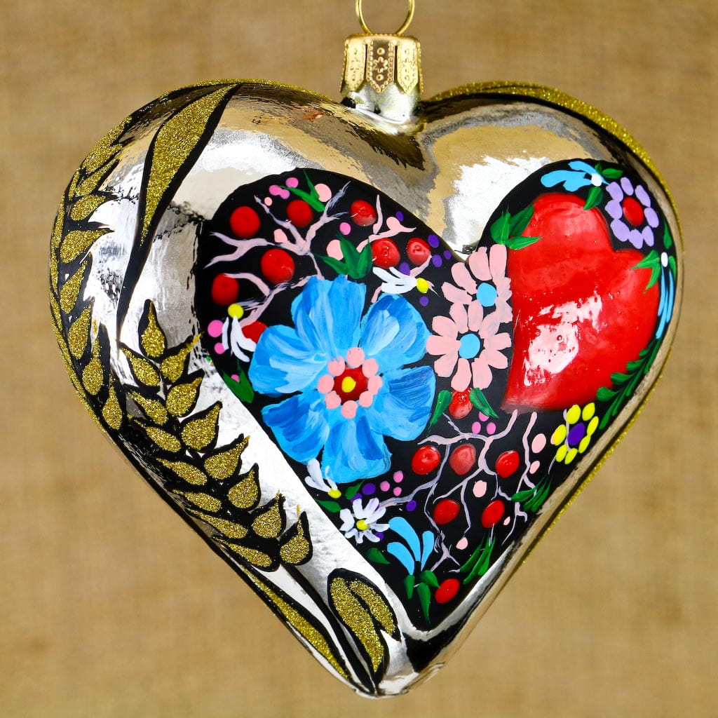 Wiszące szklane serce zdobione w ludowe dekoracje. Wykonane z dmuchanego szkła, ręcznie malowane z dbałością o najmniejsze detale,