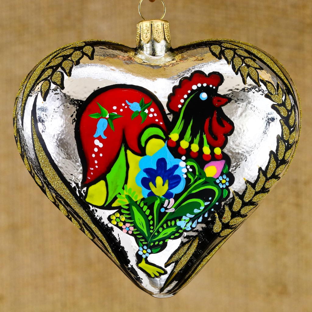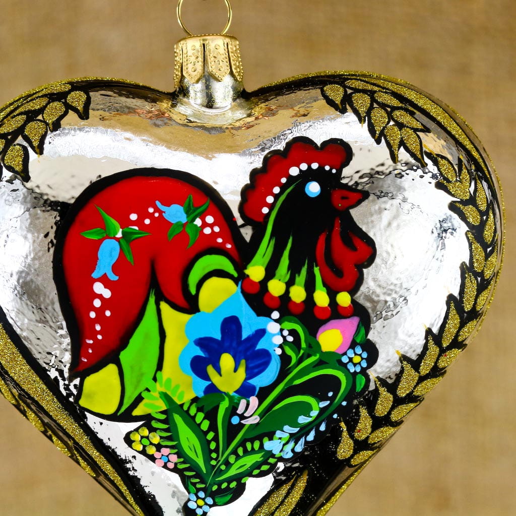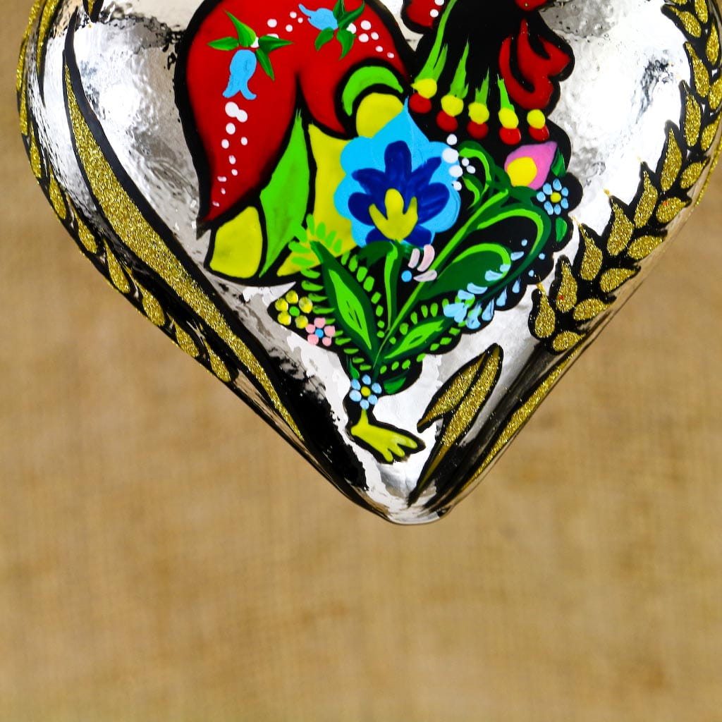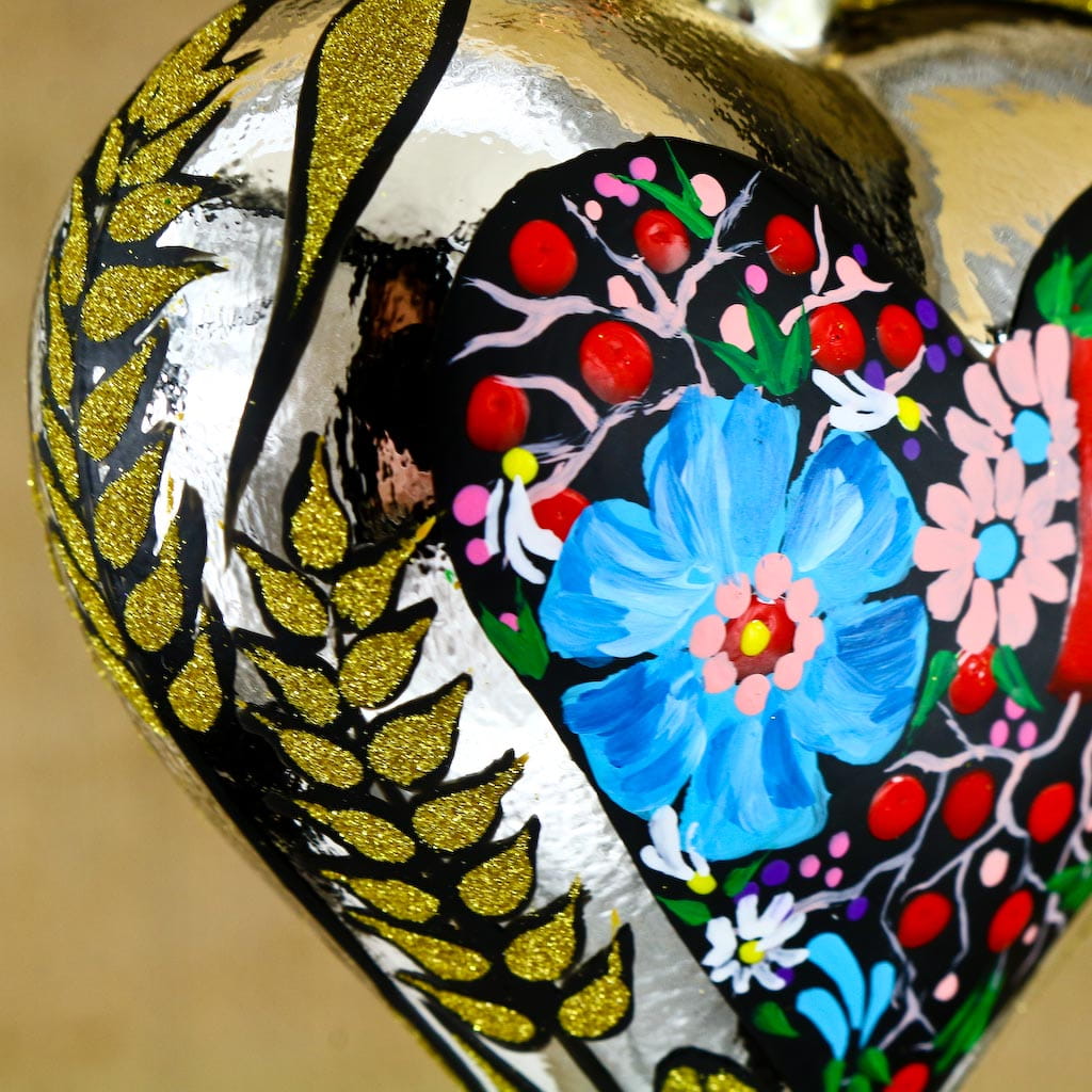 Wiszące szklane serce zdobione w ludowe dekoracje. Wykonane z dmuchanego szkła, ręcznie malowane z dbałością o najmniejsze detale,