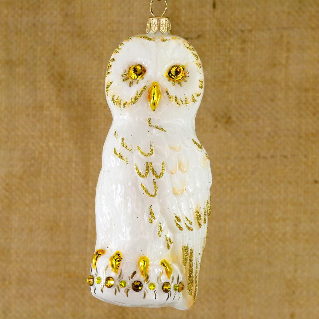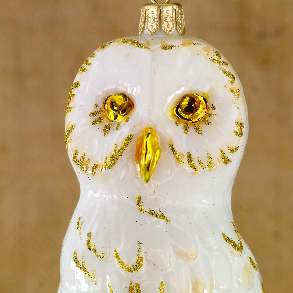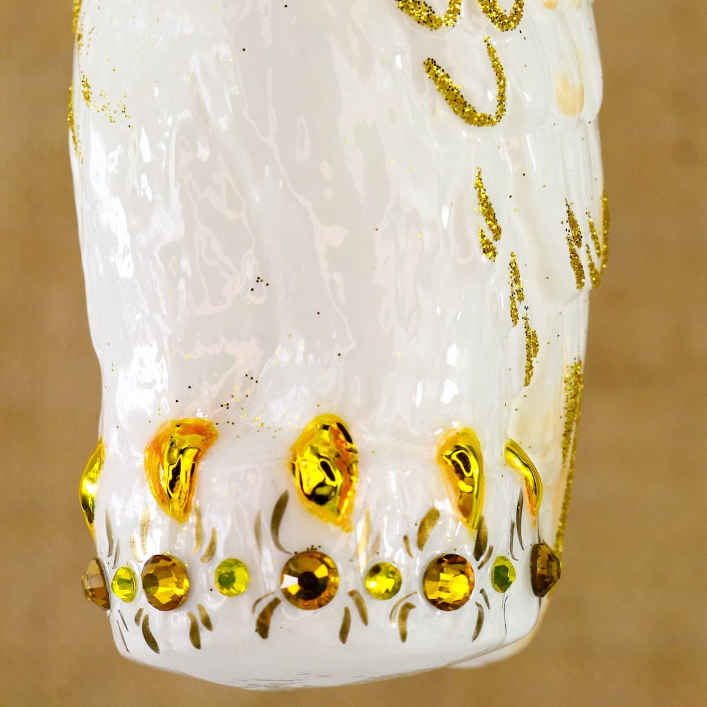 Bombka Sowa biało-złota, szklana ręcznie malowana, wykonana z dmuchanego szkła.